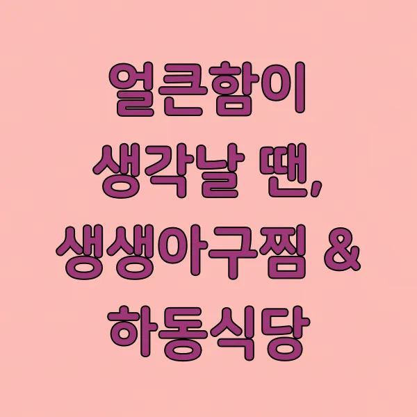 Q4. 생생아구찜과 하동식당은 어떤 메뉴가 대표적인가요? A4. 생생아구찜은 얼큰한 아귀찜과 해물찜이 대표 메뉴이며, 하동식당은 깊고 진한 국물의 국밥이 유명합니다.