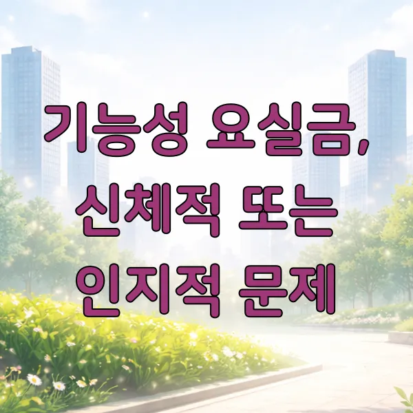 기능성 요실금은 소변을 저장하거나 배출하는 기능 자체에는 문제가 없으나, 다른 요인으로 인해 발생하는 경우 를 말합니다.